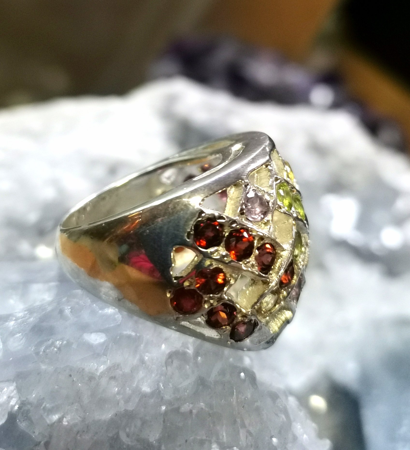 Grosse bague ajourée en Argent 925, et Pierres fines (Grenat, Peridot, Améthyste, Citrine)