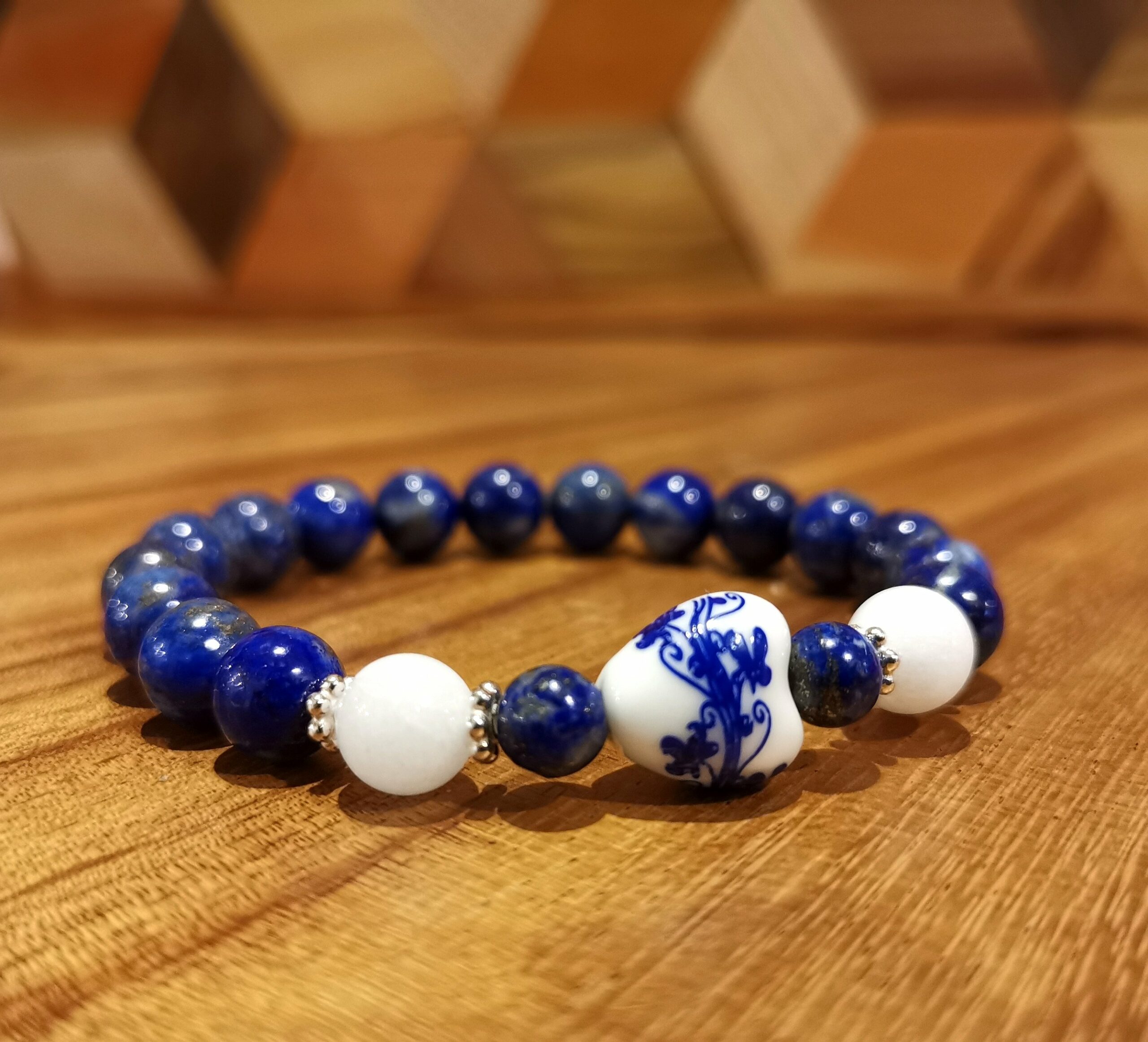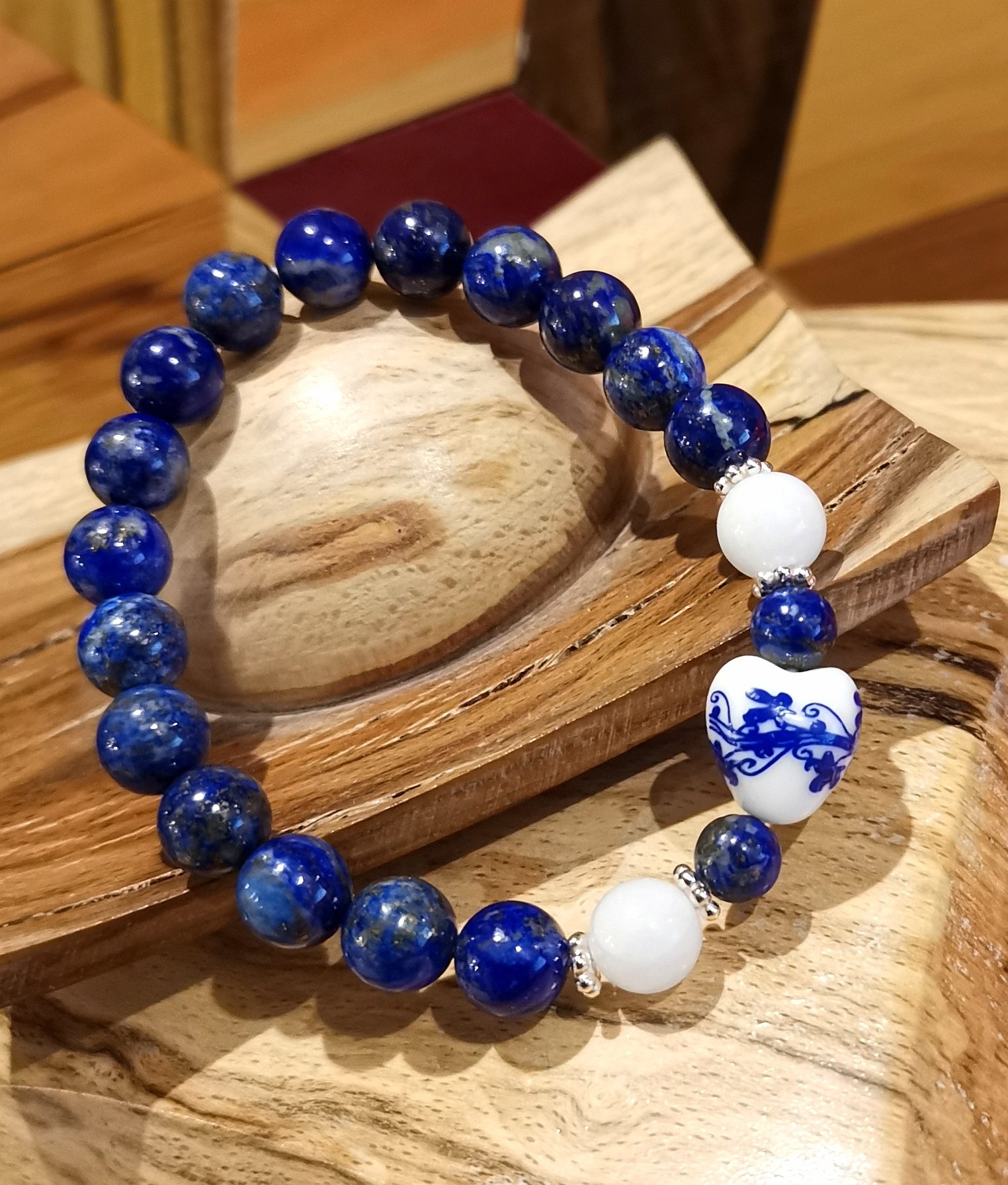 Bracelet (16 cm)  » Cœur  » en perles de Lapis Lazuli, Agate Blanche (8 mm) , Argent 925, et Cœur en Céramique.